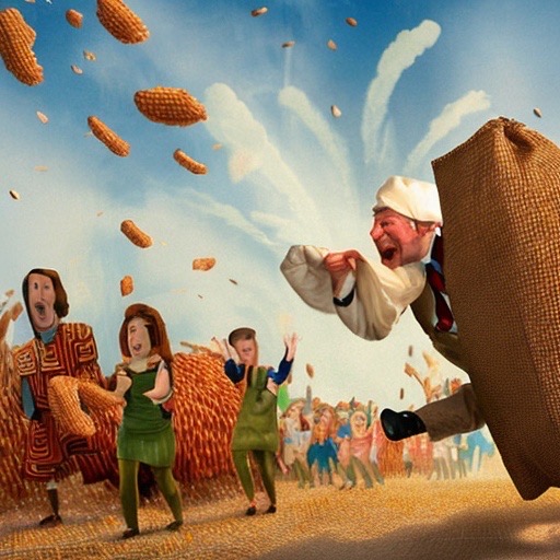 An diesem besonderen Tag jedoch hatte der alte Stadtbote, Heinrich, ein bisschen zu viel des erfrischenden Sommerweins genossen. Mit wackeligen Beinen stolperte er über den Marktplatz, vorbei an lachenden Kindern und klatschenden alten Damen. Und dann passierte das Unvermeidliche – er prallte gegen den riesigen Sack Reis, der plötzlich ins Rollen kam!