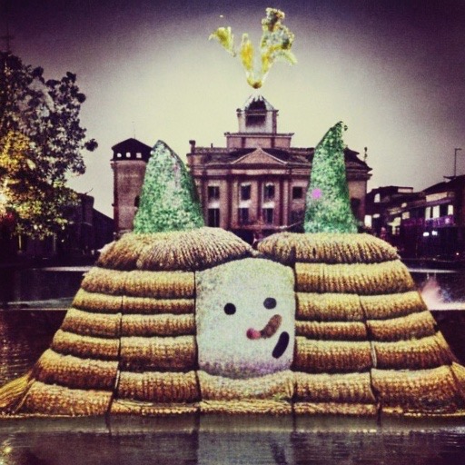 Das Rathaus wurde zu einem majestätischen Reisberg und die Bäckerei verwandelte sich in eine riesige Sushibar. Die Bäume waren mit Reiskörnern verziert, als ob sie in der festlichen Jahreszeit geschmückt wären.